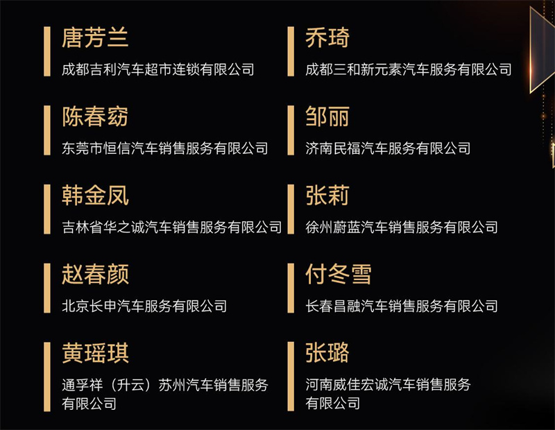 作為2023(第十八屆)中國汽車金扳手獎評選的同期活動,2023全國十佳金扳手續保專員評選旨在讓經銷商更加重視續保這一有效降低客戶流失的重要舉措,進而增加經銷商的盈利和服務能力,同時展示續保專員的技能風采。該評選采用抖音點贊、線上答題、行業專家評審的形式,多輪次、多角度對選手們做出專業、全面、準確的考核。經過層層嚴格選拔,最終來自10個品牌的10位續保專員從中脫穎而出,獲得2023全國十佳金扳手續保專員榮譽稱號。