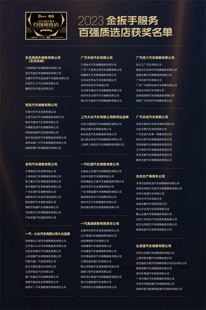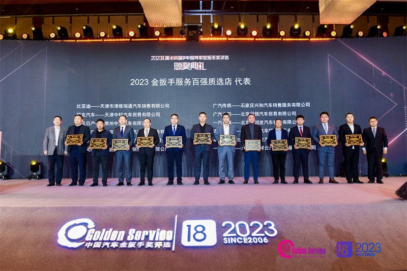 為了樹立品牌服務標桿榜樣,助力提升汽車服務質量,促進良好市場環境,主辦方同期舉辦了2023金扳手服務百強質選店評選活動,該評選由中國汽車維修行業協會指導,依據金扳手GES-150服務評價標準和《放心汽修認證》團體標準,對候選經銷商進行專業評審,最終共有12個品牌的全國100家優秀經銷商獲得“2023金扳手服務百強質選店”榮譽稱號,他們代表了行業頂級水準的“金扳手”服務。
