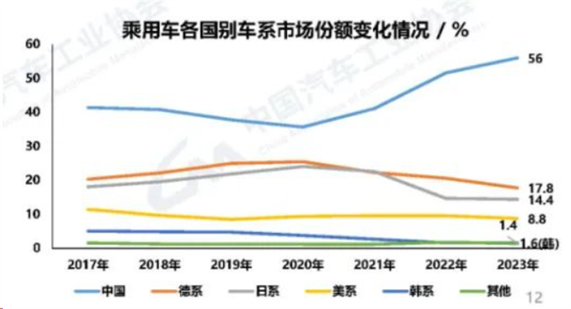 據中國汽車工業協會統計的數據顯示,2023年中國乘用車銷量為2192.3萬輛,同比增長4.2%,其中中國品牌乘用車銷量為1459.6萬輛,同比增長24.1%,市場份額高達56%,比2022年上升了6.1個百分點。與此同時,合資品牌乘用車市場份額不斷被蠶食,德系和日系從之前的20%以上下滑到15%左右,韓系甚至跌落到1.6%,法系則更低。