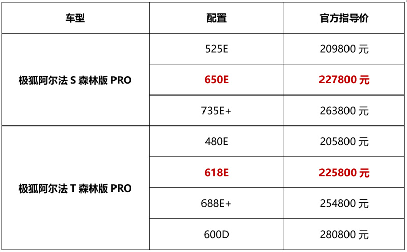 1月25日,極狐汽車放出連環大招,阿爾法S/T森林版PRO整體在原森林版基礎上,圍繞前后排座椅加熱/按摩、真皮方向盤、熱泵空調等豪華、舒適性配置進行多維升級,同時還新增了阿爾法S森林版PRO 650E、阿爾法T森林版PRO 618E,官方指導價分別為22.78萬元、22.58萬元。