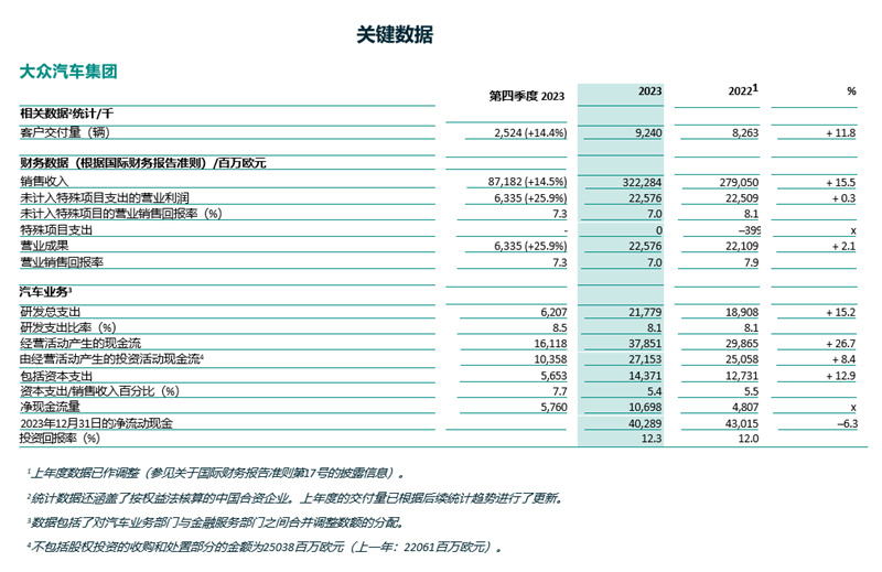 在支付約110億歐元股息后,汽車部門凈流動性在年末仍穩(wěn)健保持在403億歐元的水平(2022年:430億歐元)。