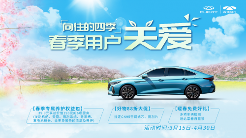 3月氣溫逐漸回暖,又到了出門春游踏青的好時節(jié)。始終以用戶為中心的奇瑞,以實(shí)力寵粉,特別為用戶推出向往的四季-春季用戶關(guān)愛活動,其中包含多項(xiàng)活動權(quán)益,助力車主朋友暢享春天的美好心情。活動有效期為3月15日-4月30日,長達(dá)一個半月,快來一起看看吧!