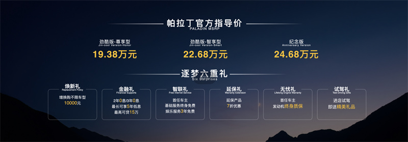 4月16日,鄭州日產(chǎn)帕拉丁紀(jì)念版和勁酷版上市發(fā)布會在鄭州舉行。兩款新車以更為強大的越野性能,向帕拉丁征戰(zhàn)達喀爾拉力賽20周年致敬,續(xù)寫自由逐夢的品牌傳奇。其中,紀(jì)念版售價24.68萬元,勁酷版-智享型售價22.68萬元,勁酷版-尊享型售價19.38萬元,以“更越野、更舒適、更便利”的卓越品質(zhì),再度拓展廣大用戶“越覽山河、縱情逐夢”的生活邊界。