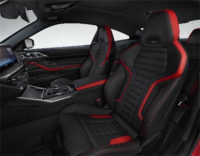 質感細膩的M碳纖維內飾飾條首次應用于BMW 4系車型,營造出令人耳目一新的豪華運動氛圍。全系標配的前排運動型座椅采用高級工藝Sensatec合成皮,搭配精致縫線與打孔工藝,觸覺與視覺感受完美兼顧,客戶也可選擇新增的黑/紅拼接Vernasca真皮座椅,以嶄新姿態喚醒前所未有的駕駛激情。新BMW 4系雙門轎跑車提供首次在BMW車型中使用的M Performtex針織/麂皮絨材質座椅,醒目的M縫線精致動感,實現了美感、質感、輕量化和可持續生產方法的完美融合。全系標配的M運動型多功能真皮方向盤帶換擋撥片,采用全新的平底式設計,提升駕駛體驗的同時進一步強化運動氛圍。全新設計的空調出風口帶輪廓照明、新增的璀璨水晶質感內飾組件格調雅致,營造出令人耳目一新的豪華氛圍。