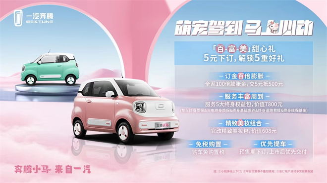 4月30日,奔騰小馬正式開啟預售,共發布3款車型、6種車身顏色,其中122km萌趣馬預售價2.89萬元、170km元氣馬預售價3.19萬元、170km活力馬預售價3.49萬元。