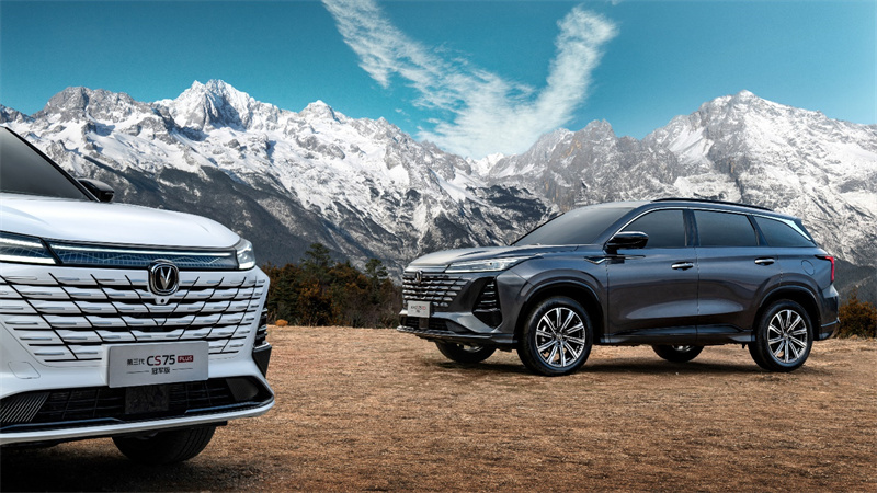 從左往右依次為第三代CS75PLUS冠軍版、峰蘭達雙擎領先版、星越L長風版