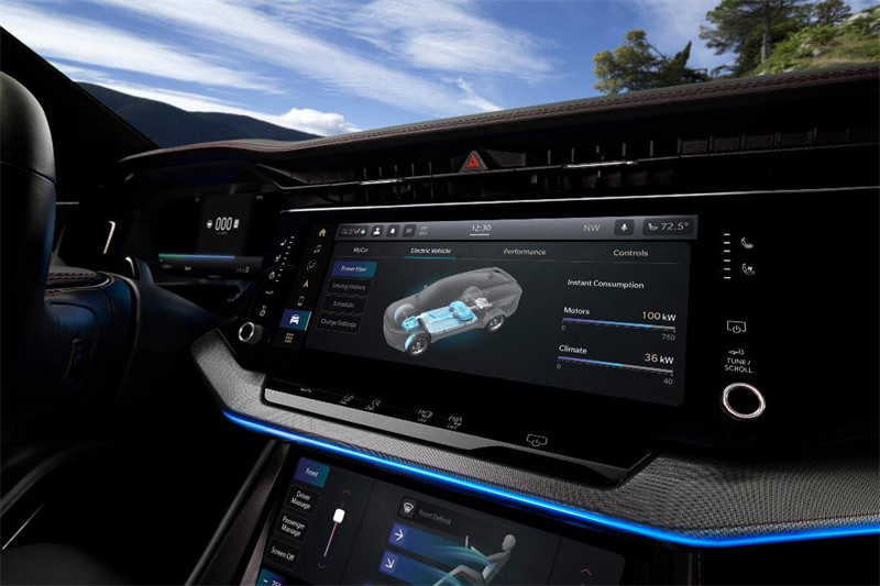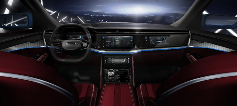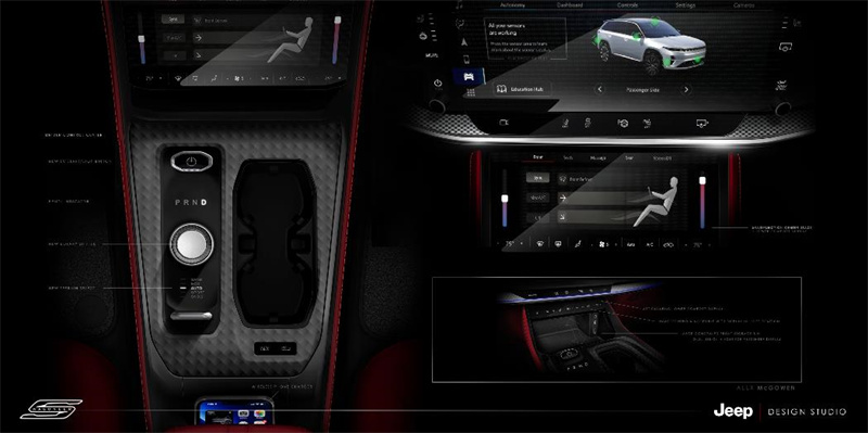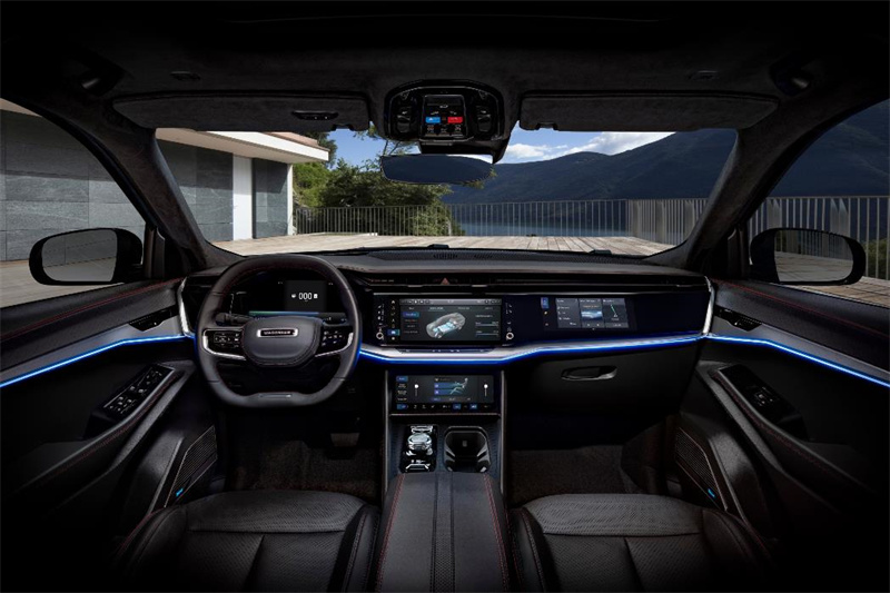 新車座艙的設計靈感來自目前在售的Jeep Grand Wagoneer車型,其全數字化設計時尚且線條流暢,融合現代化控制裝置與直觀交互界面。前排座艙的亮點在于其極具雕塑感的橫向翼形設計,這一設計元素與橫跨整個前儀表板的顯示屏完美融合,形成視覺統一。而精致的酒紅色裝飾縫線及雕刻般的金屬飾條,則為整體內飾增添了奢華感。集成式12.3英寸中央顯示屏設計匠心獨運,其外框巧妙結合了多種材料,精致的貼花由各式金屬材質打造,并飾以釉面花邊圖案,彰顯無與倫比的工藝美學。
