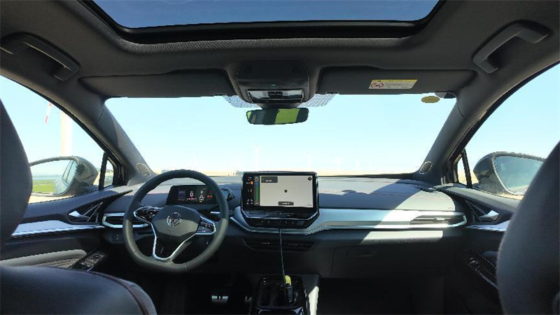經過風車田時,那些巍峨的風車在微風中輕輕轉動,它們巨大的葉片在空中劃出優美的弧線,與ID.4 CROZZ那動感十足的身姿共同繪成了一幅美麗的畫卷。此刻,我深切體會到了ID.4 CROZZ內飾的精巧與舒適。2024款ID.4 CROZZ儀表板上的INS透光飾條,在光線的照耀下散發出柔和的光芒,不僅提升了內飾的時尚感和現代氣息,還增添了空間的層次感,為駕駛艙營造出了獨特的氛圍,仿佛每一處細節都在訴說著匠心獨運的故事。而新款ID.4 CROZZ PURE+版的三幅式多功能方向盤,采用超纖材質打造,手感細膩且耐磨,如同握住了未來的脈搏,讓駕駛更加愜意且操控自如。我輕輕轉動著方向盤,感受著它行駛在戈壁灘上帶來的每一寸反饋,心中不禁涌起一股難以言喻的滿足感。
