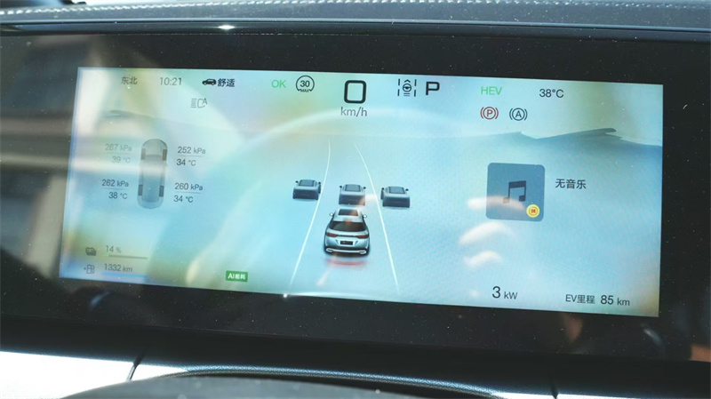 準備就緒以后,第一次記錄比亞迪宋L DM-i里程,可以看到表顯綜合油耗為1332km(動態續航),表顯電量為14%,處于混動模式介入最低電量,屬于饋電狀態能量管理系統調至AI能耗管理,駕駛模式和動能回收調整至標準,開啟我們的測試之旅。