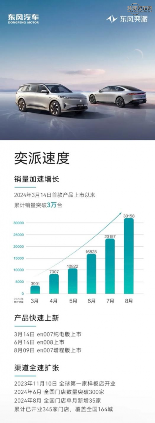 迅猛的產品推新速度和完善的渠道布局,助力東風奕派銷量節節攀升。從2024年3月14日首款產品上市以來,東風奕派僅用5個多月,就迎來了累計銷量突破3萬臺的里程碑時刻。