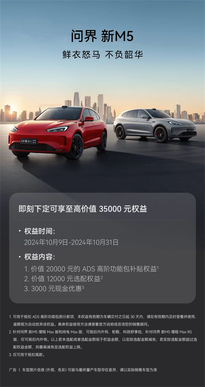 目前,問界新M5系列還推出了限時(shí)購(gòu)車禮遇。截止至10月31日,消費(fèi)者在購(gòu)買問界新M5時(shí)可以享受多項(xiàng)優(yōu)惠,包括價(jià)值12000元的選配金、價(jià)值20000元的ADS高階包抵扣券,還有3000元的現(xiàn)金優(yōu)惠,使得購(gòu)車成本進(jìn)一步降低。此外,問界新M5全系車型依然延續(xù)0首付、2.49%金融優(yōu)惠的購(gòu)車方案,大大降低了購(gòu)車門檻,為更多消費(fèi)者提供了入門智能車的機(jī)會(huì)。