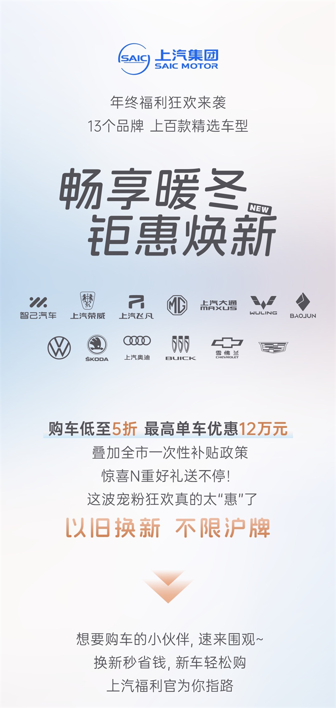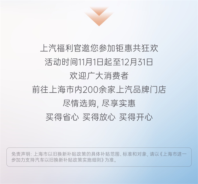 (2024年11月1日,上海)為了進一步推動消費品“以舊換新”,助力“中國國際消費中心城市精品消費月”活動,今天上海市正式發(fā)布新的汽車領域以舊換新消費政策。至2024年12月31日,消費者在上海通過舊車置換購買純電動車或燃油車,符合特定條件的情況下可享受政府一次性1.5萬元或1.2萬元補貼,均不限滬牌(具體補貼范圍、標準和對象,請參見《上海市進一步加力支持汽車以舊換新補貼政策實施細則》)。上汽集團積極響應政策號召,同樣以真金白銀回饋廣大消費者,提振消費信心、點燃消費熱情。十三個品牌、上百款精選車型,最高優(yōu)惠可達12萬、低至五折,誠邀您蒞臨“2024上海汽車消費嘉年華”!歡迎廣大消費者前往上海市內(nèi) 200 余家上汽品牌門店,盡情選購、盡享實惠。