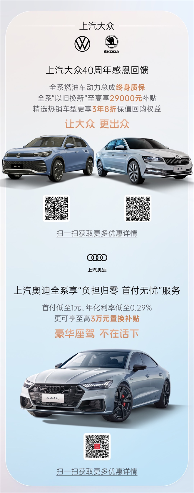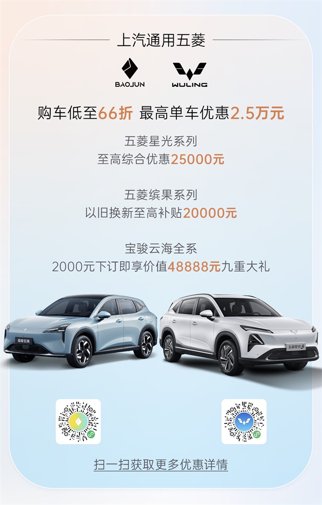 優(yōu)惠內(nèi)容干貨滿滿,誠意十足。此次上汽旗下參與活動的車型,在疊加以舊換新補貼后,整體優(yōu)惠幅度可達五至八折,同時還特別推出了300多輛“限量彩蛋車”,單車優(yōu)惠金額最高可達12萬元,免首付、免利率、免保險,現(xiàn)金優(yōu)惠、置換補貼、終身免費保養(yǎng)。“滿滿干貨”讓您購車用車體驗“再升級”!(上汽集團具體購車細則請見下文長圖)