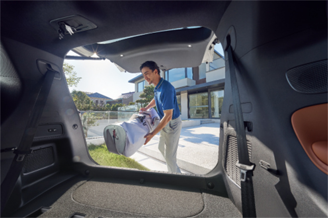 豪華MPV空間不在于大,更在于靈活多變。E9超級快充版行李箱Y向尺寸增大137mm,市場主流高爾夫球桿包可輕松放下,并新增同級獨有行李廂二排座椅一鍵調節功能,放置大件行李時原地一按即可前移二排擴大空間,配合三排同級唯一220mm滑軌,收納超大行李時更便利,讓車成為貼心舒享的移動之家。