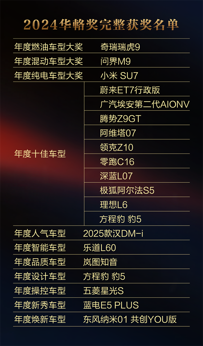 經(jīng)過嚴格的評選流程,最終有20款新車從數(shù)百款參評車型中脫穎而出,榮獲各類大獎。其中,小米SU7榮獲年度電動車型大獎,問界M9獲得年度混動車型大獎,奇瑞瑞虎9獲得年度燃油車型大獎。此外,蔚來ET7行政版、廣汽埃安第二代AION V等十款車型被評為年度十佳車型。比亞迪的2025款漢DM-i則憑借超高人氣贏得了年度人氣車型稱號。