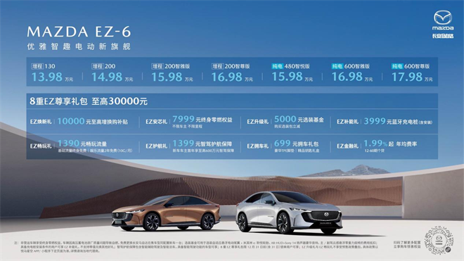 為了讓更多的消費者能夠體驗到MAZDA EZ-6的魅力,長安馬自達推出了超低起售價13.98萬元,以及高達30,000元的購車權益。購買EZ-6的用戶還可以享受8重EZ尊享禮包,包括增換購補貼、終身零燃權益、選裝基金、藍牙充電樁等多重優惠。