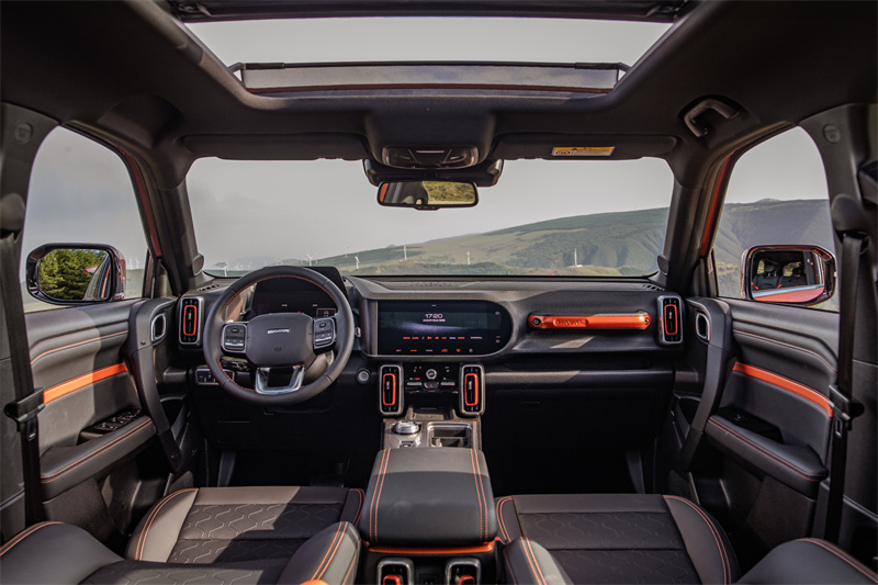 哈弗大狗及二代大狗燃油版均搭載了智能電控四驅及后橋電控機械牙嵌式差速鎖。其中,電控四驅可以通過整車ESP和中央限滑差速器將動力自動分配至四個車輪,維持四輪在雪地、坡道上的抓地力,提高整車的操控性。當我們行駛在立交高架、十字路口等易結冰的路段,四驅系統可以時刻穩定車身姿態,保障行車安全。差速鎖利用機械牙嵌齒鎖死差殼與半軸齒輪,實現后橋兩側車輪的剛性連接,功能可靠,可實現后橋兩側車輪間扭矩100%輸出,從而順利脫困。針對同樣的冰雪路段,二代大狗Hi4版搭載了全球首創的Hi4智能四驅電混技術,三動力源雙軸布局,1.5T混動專用發動機+前驅動模塊總成+后驅動模塊總成,確保車輛在冰雪濕滑路面增強附著力,依托強勁動力輸出讓車輪快速旋轉,從而起到控制方向及脫困的作用。