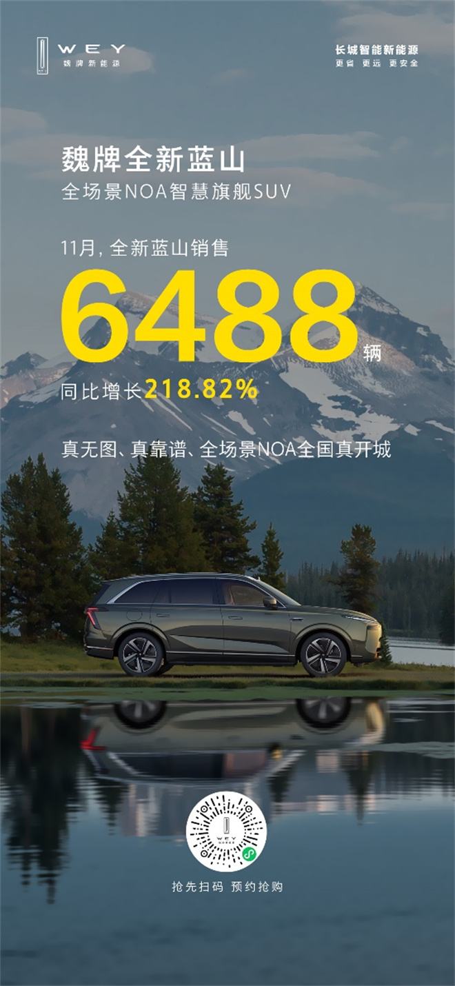 憑借全面卓越的硬核實力,全新藍山以頭部優等生的姿態披荊斬棘,持續贏得市場與用戶的廣泛認可與信賴,引領了大六座新能源SUV市場的發展方向。據最新銷量數據顯示,魏牌全新藍山11月銷售6488輛,同比增長218.82%,保持強勁增勢,不斷綻放中國智造高端實力的“魏牌風采”。