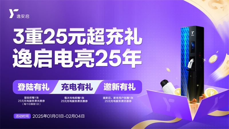 伴隨著逸安啟超充站正式突破100座的喜訊,2025年元旦佳節也即將到來,為了讓更多用戶感受逸安啟的臻享超充魅力,讓快捷、可靠、從容的臻享超充服務惠及更多的用戶,逸安啟將在2025年1月1日正式推出三重好禮活動,用戶無論是在登陸、充電還是邀請好友時都能享受到每次25元充電服務費優惠券,多種豐富的超充臻享禮遇助力用戶“電亮”全新一年。屆時用戶可通過逸安啟超充小程序/APP參與活動,歡迎廣大新能源車主到站體驗。更多消息,請持續關注逸安啟超充。