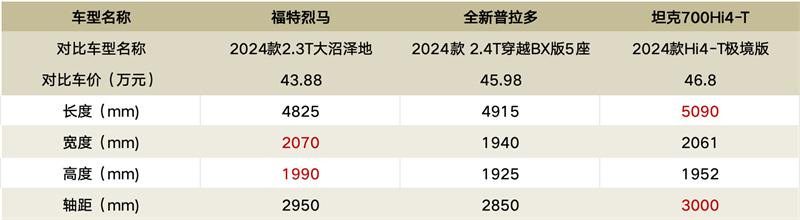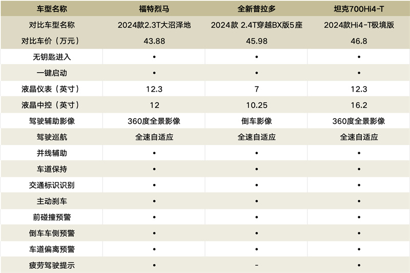 綜合來看,全新普拉多在品牌口碑、越野性能和市場關注度等方面表現突出,坦克700Hi4-T在動力、空間和科技配置上具有優勢,福特烈馬則在外觀和空間上有一定的特點,但品牌認可度、市場定位等方面存在不足。