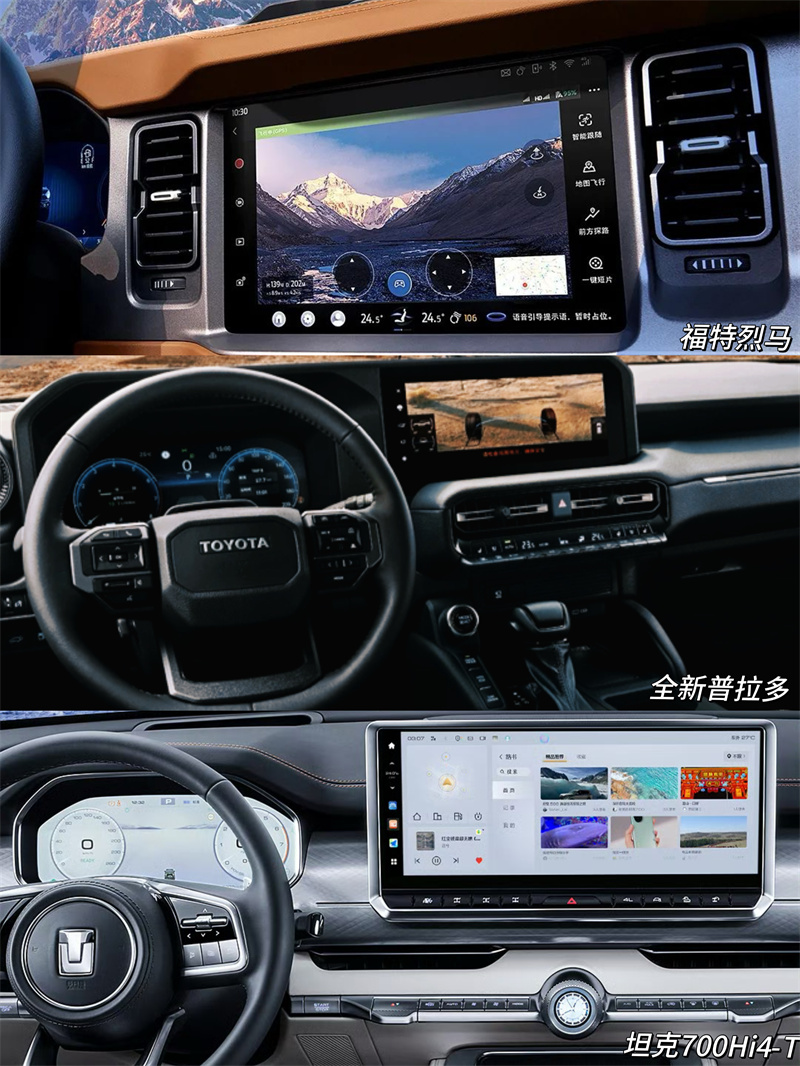 就參與對比的三款車型來說,整體配置大體相當,但細節上,坦克700HI4-T發揮出國產車的先天優勢,以12.3+16.2英寸的雙大屏,實現斷層領先;福特烈馬緊跟其后,同樣配備360度全景影像;而這款入門級全新普拉多配備的10.25英寸中控屏,雖然尺寸小了點,但清晰度和流暢性都在線,且次頂配及以上車型升級為12.3英寸。隨著科技配置的持續迭代升級,過去“開不壞的普拉多”,除了高度品質認可外,現代化的賦能也廣受好評。