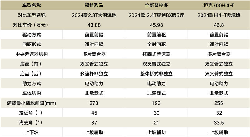 坦克700Hi-T最大接近角32°和最大離去角33.5°的設計,在三者中都處于中間的水平。前后雙叉臂式的獨立懸架,也讓它舒適性更勝一籌。而福特烈馬45°接近角、37°離去角的表現,則在三車中領銜,爬坡能力更強。再加上273mm的離地間隙和925mm的最大涉水深度,讓它在越野通過性上表現非常出色,無論是面對復雜的山地、泥濘道路還是涉水路段等,都能有較好的通過性能。