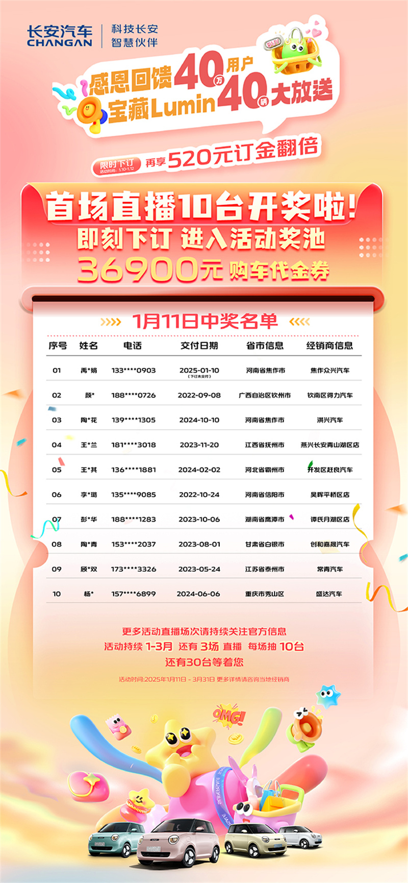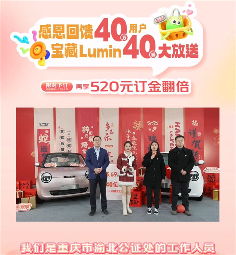 值得一提的是,首場直播僅是“感恩回饋40萬用戶”活動的開端。接下來,長安汽車將在2025年2月-3月內舉辦剩余3場直播抽獎活動,剩余的30臺寶藏Lumin將陸續送出。此外,1月10日-1月12日下訂的用戶還能享受520元訂金翻倍,新年開新車購車更輕松。