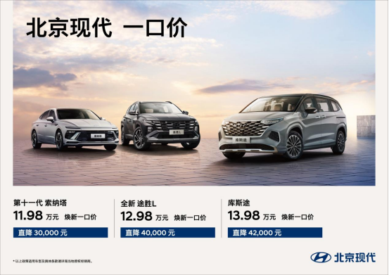其中,第十一代索納塔的煥新一口價為11.98萬元起,直降3萬元;全新途勝L、庫斯途的優惠后起售價格也分別拉低至12.98萬元和13.98萬元,直降優惠超過4萬元。