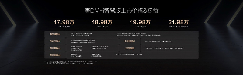 此次,唐DM-i智駕版共推出4款車型,售價17.98萬~21.98萬元,真正實現(xiàn)加配不加價。同時,比亞迪為用戶準備了包括“尊享煥新禮、尊享無憂禮、尊享貴賓禮、尊享智聯(lián)禮、限時選裝禮、延保服務”六重購車禮遇。