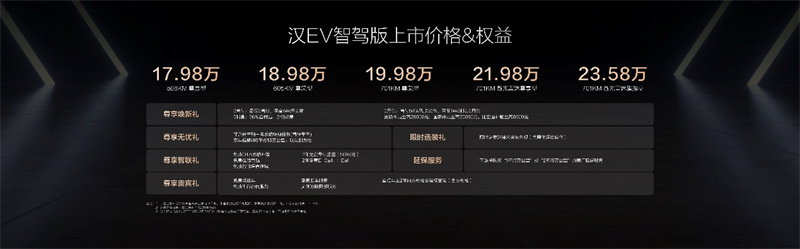同時,漢智駕版還為用戶準備了包括“尊享煥新禮、尊享無憂禮、尊享貴賓禮、尊享智聯禮、限時選裝禮、延保服務”六重購車禮遇。