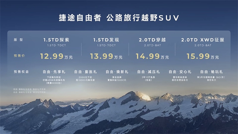 2月14日,情人節之際,捷途XWD技術品鑒暨自由者預售發布會在上海隆重舉行。在這場盛會上,捷途方盒子冠軍家族迎來了新成員——捷途自由者,并正式開啟了預售序幕。四款車型各具特色,1.5TD探索版售價12.99萬,1.5TD發現版13.99萬,2.0TD穿越版14.99萬,而頂配的2.0TD XWD征服版則售價15.99萬。車身顏色方面,提供了布羅莫藍、青山翠等六種時尚選擇,滿足年輕消費者的個性化需求。
