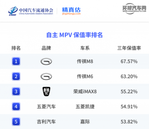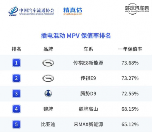 保值率方面,根據2024年度中國汽車流通協會發布的數據,傳祺M8和M6的三年保值率分別高達67.57%、63.20%,穩居中國品牌MPV保值率第一和第二。新能源車方面,傳祺E8和E9分別以73.68%、73.27%的一年保值率包攬插混MPV保值率榜單的冠亞軍。