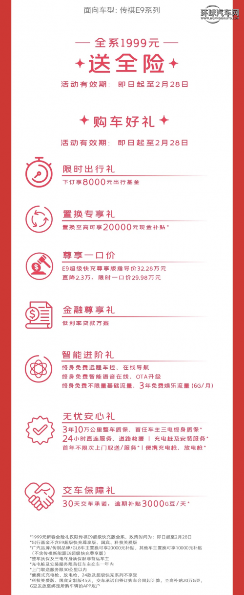 另外2月購買傳祺M6、M8和E9,僅需支付1999元就送全險,購買傳祺E8+即享999元送全險!