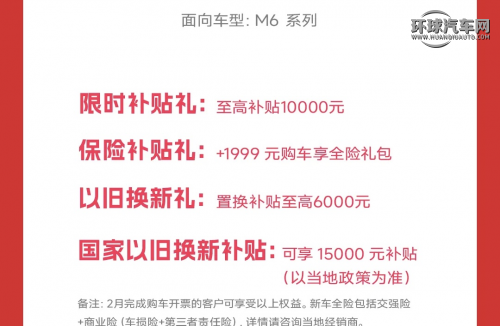 購買傳祺M6的客戶可享受1萬元的限時補貼禮!另外除了1.5萬元的國家置換補貼,廣汽傳祺還再疊加至高6000元的置換補貼!