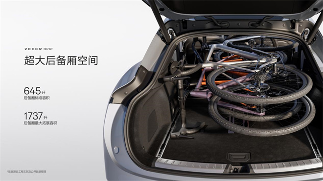 極氪獵裝更能裝。得益于浩瀚原生純電架構L113最優布局,極氪007GT擁有2925毫米超長軸距,83.5%超大得房率,車內縱向有效空間接近2.5米,同級最大。后排腿部空間超越同級轎車和旅行車,頭部空間也很充裕。645升后備廂容積超過80%同級SUV,后排座椅放倒后可拓展至1737升,輕松容納3輛公路自行車。
