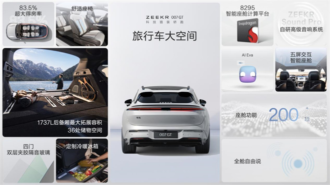 ● 旅行車大空間:83.5%超大得房率,靈活拓展同級獨有,座椅舒適、音響視聽、智能化體驗全部拉滿,極氪007GT讓用戶滿載熱愛即刻出發。