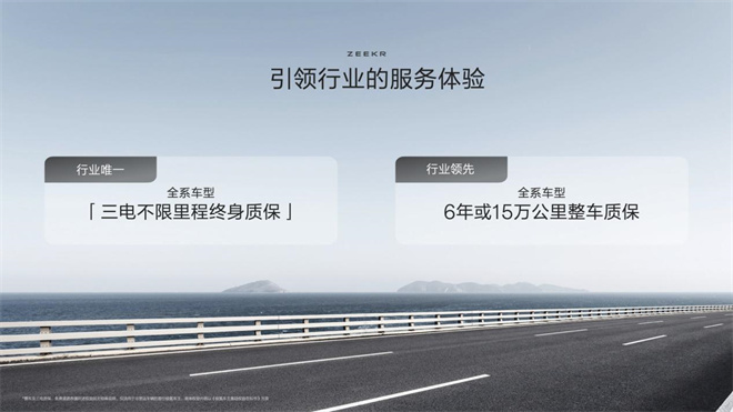 豪華服務,要有引領行業的服務體驗。極氪提供全系車型“三電不限里程終身質保”,行業唯一,并在全行業率先取消關于長期停放的全部免責條款。極氪提供高速免費救援服務,行業唯一。新車4年或10萬公里內免費道路救援,覆蓋全國任何道路,高速拖車費用不限里程全額報銷,行業唯一。 還有“1小時快保,24小時快噴”、遠程預警診斷及主動提醒、車輛代客值守、免費取送車、免費維保接送等服務,新老用戶同享。