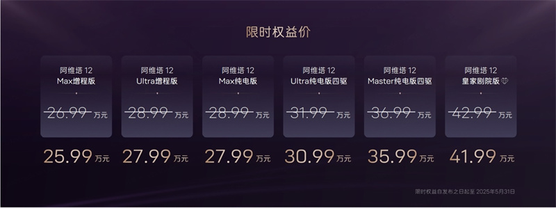 阿維塔12 2025款以26.99萬元起售,疊加1萬元現金權益后僅需25.99萬元即可入手。全系標配價值2萬元的華為ADS高階智駕抵扣券,頂配車型更可享4萬元綜合權益,包括英國之寶25揚聲器音響、21英寸運動輪轂等硬核配置。相比保時捷帕拉梅拉百萬級的選裝成本,阿維塔12以1/3價格實現"帕梅平替",岱紅內飾與3.8秒零百加速直接對標超豪華體驗。