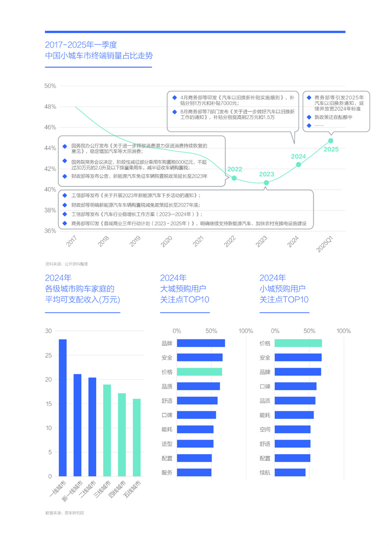由于小城車(chē)市的家庭收入水平低于大城,2024年中國(guó)一線購(gòu)車(chē)家庭的平均收入高達(dá)28.26萬(wàn)元,但五線城市僅有16萬(wàn)元,小城購(gòu)車(chē)用戶(hù)對(duì)價(jià)格會(huì)更加敏感,2024年價(jià)格因素位居大城預(yù)購(gòu)用戶(hù)關(guān)注點(diǎn)的第三位,但位居小城榜首。面對(duì)2022-2024年的一系列補(bǔ)貼政策,小城車(chē)市自然更容易被刺激;