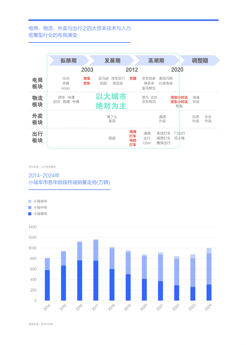 2012年起,隨著中國(guó)移動(dòng)端互聯(lián)網(wǎng)經(jīng)濟(jì)的快速普及,快速把國(guó)際資本來(lái)華投入推向高潮。圍繞出行、外賣(mài)、物流、旅游、直播等眾多細(xì)分賽道,阿里系、騰訊系、百度系、字節(jié)系等,以及背后的大資本,開(kāi)展了一場(chǎng)場(chǎng)史詩(shī)級(jí)的大火拼,互聯(lián)網(wǎng)+概念橫空出世,助力互聯(lián)網(wǎng)經(jīng)濟(jì)強(qiáng)勢(shì)整合傳統(tǒng)經(jīng)濟(jì)。期間,各家互聯(lián)網(wǎng)企業(yè)就像一臺(tái)臺(tái)開(kāi)足馬力的水泵,從小城搶奪大量青壯年勞力,小城的勞務(wù)輸出全面轉(zhuǎn)向青年為主的新模式。2018-2019年,隨著社區(qū)電商、小時(shí)達(dá)等新商業(yè)模式的快速涌現(xiàn),互聯(lián)網(wǎng)企業(yè)對(duì)小城青壯年勞動(dòng)力的搶奪更為瘋狂。小鎮(zhèn)青年的大量流失,直接導(dǎo)致小城車(chē)市的增長(zhǎng)勢(shì)頭從2018年起戛然而止;
