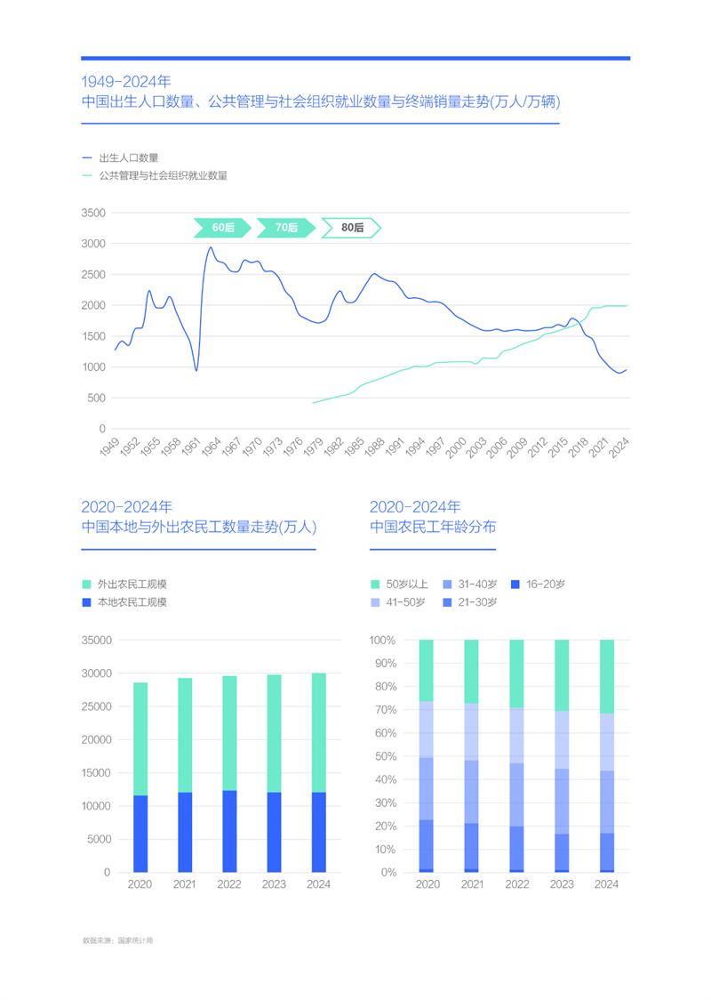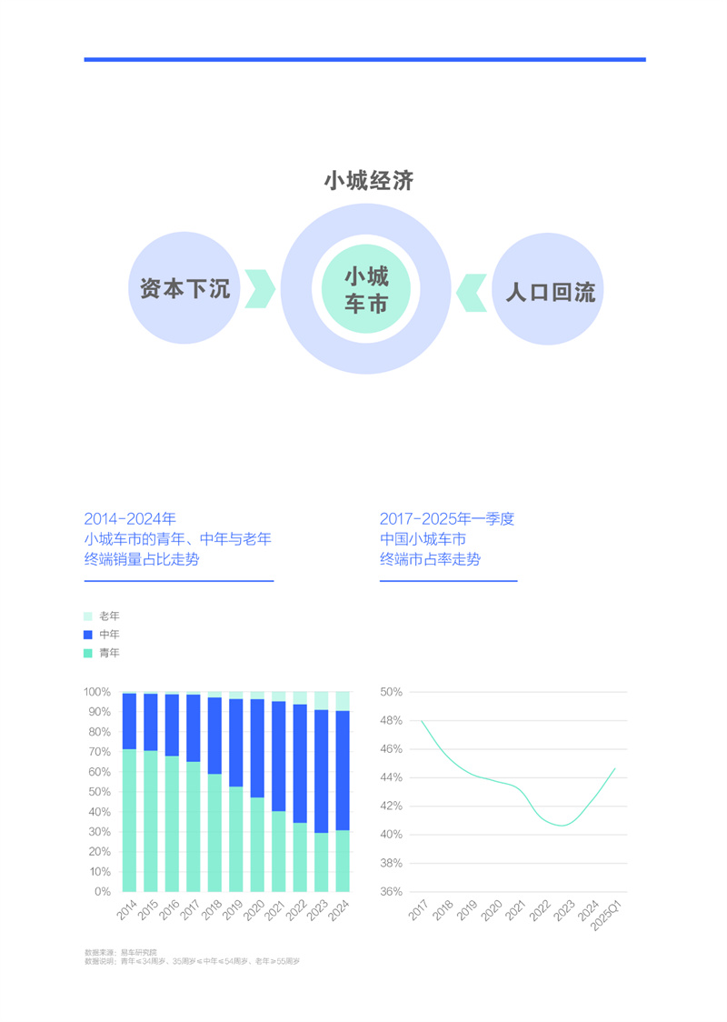 2023-2024年,小城車(chē)市快速崛起,市占率隨之提升。其直接原因首推2022-2025年各級(jí)政府密集出臺(tái)的一系列短期補(bǔ)貼政策,因?yàn)閷?duì)價(jià)格更敏感的小城車(chē)市更容易被刺激 。小城車(chē)市的本輪崛起是否可持續(xù),取決于土地/資源、資本、人力、技術(shù)與制度等要素的持續(xù)投入與改善:近十多年,小城車(chē)市由盛轉(zhuǎn)衰的根源,在大城經(jīng)濟(jì)快速資本化,吸引了大量小鎮(zhèn)青年,導(dǎo)致小城車(chē)市大幅萎縮;疫情后,電商、旅游、直播、短視頻等各賽道的大量資本,積極響應(yīng)共同富裕政策,加速“上山下鄉(xiāng)”,吸引部分青年回鄉(xiāng);與資本下沉同時(shí)發(fā)生的是“告老還鄉(xiāng)”,越來(lái)越多的60后、70后,攜資本與技術(shù),回鄉(xiāng)養(yǎng)老與創(chuàng)業(yè)。資本下沉帶動(dòng)的青年返鄉(xiāng),與老年退休滋生的告老還鄉(xiāng),在小城車(chē)市已得到初步驗(yàn)證。雖然老年與青年的銷(xiāo)量占比有所提升,但小城車(chē)市的主力在中年……小城車(chē)市的含金量在持續(xù)提升;