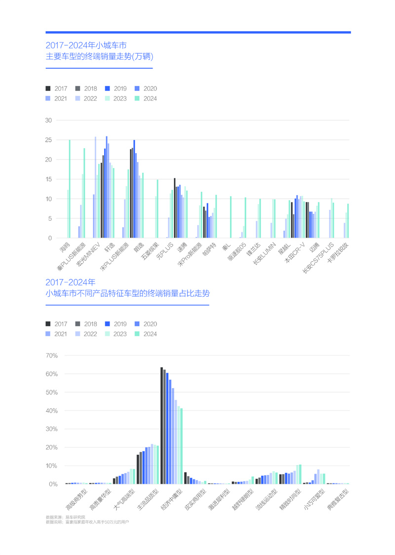 隨著中年化持續(xù)顯著,2017-2024年,小城車(chē)市的產(chǎn)品特征變化巨大:朗逸、軒逸、哈弗H6等曾經(jīng)深受小城青年喜歡的經(jīng)濟(jì)中庸型產(chǎn)品的市占率,由63.52%跌至41.22%多點(diǎn),足足少了兩成多的市場(chǎng)份額。2024年,哈佛H6跌出了小城車(chē)市銷(xiāo)量TOP20,軒逸和朗逸僅位居第三和第五;小城車(chē)市的銷(xiāo)量重心,持續(xù)向更適合中年家庭的主流品質(zhì)型和大氣高端型轉(zhuǎn)移,前者市場(chǎng)份額由15.96%升至20.92%,后者由3.13%升至8.20%。宋家族、星越L、瑞虎8系、邁騰、帕薩特等更適合小城車(chē)市消費(fèi)升級(jí)的產(chǎn)品,實(shí)現(xiàn)了銷(xiāo)量的快速提升與觸底反彈;2017-2024年,小巧可愛(ài)型與精致時(shí)尚型的市場(chǎng)份額都在提升,前者升至6%左右,后者超過(guò)10%,基于小城女性之強(qiáng)勁的代步需求,海鷗、宏光MINIEV、元PLUS搖身一變?yōu)橹袊?guó)車(chē)市的新爆款車(chē)型;流線運(yùn)動(dòng)型的市場(chǎng)份額由2.88%升至6.29%,越野硬朗型由1.39%升至4.14%。日后隨著中年女性與告老還鄉(xiāng)群體的持續(xù)增多,小城車(chē)市的多元化趨勢(shì)會(huì)更加顯著,不斷拓展流線運(yùn)動(dòng)型、越野硬朗型等個(gè)性化產(chǎn)品的增長(zhǎng)空間;