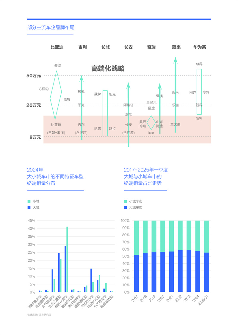 近十年,由于小城車(chē)市較長(zhǎng)時(shí)間處于衰退期,大城車(chē)市成為主要增長(zhǎng)點(diǎn),比亞迪、吉利、長(zhǎng)城、長(zhǎng)安、奇瑞等車(chē)企紛紛制定了“高端化戰(zhàn)略”,推出騰勢(shì)、仰望、方程豹、極氪、領(lǐng)克、坦克、阿維塔等一大堆售價(jià)普遍在20萬(wàn)元以上的高端品牌。蔚來(lái)、理想、小米、華為系等,干脆直接定位高端與聚焦大城車(chē)市。曾經(jīng)積極迎合小城車(chē)市傳統(tǒng)主導(dǎo)力量的小鎮(zhèn)青年的大量經(jīng)濟(jì)中庸型產(chǎn)品,紛紛陷入產(chǎn)品更新停滯的窘境,導(dǎo)致在小城車(chē)市突然崛起的初期,僅有少數(shù)車(chē)企受益;