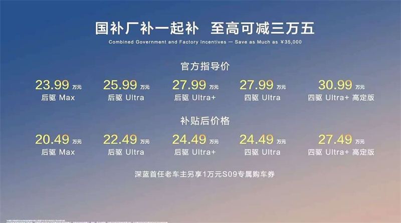 為回饋消費者的支持與信任,深藍S09推出價值高達3.5萬元的購車權益政策 ,涵蓋金融、充電、保養等多個方面,讓用戶購車、用車全程無憂。