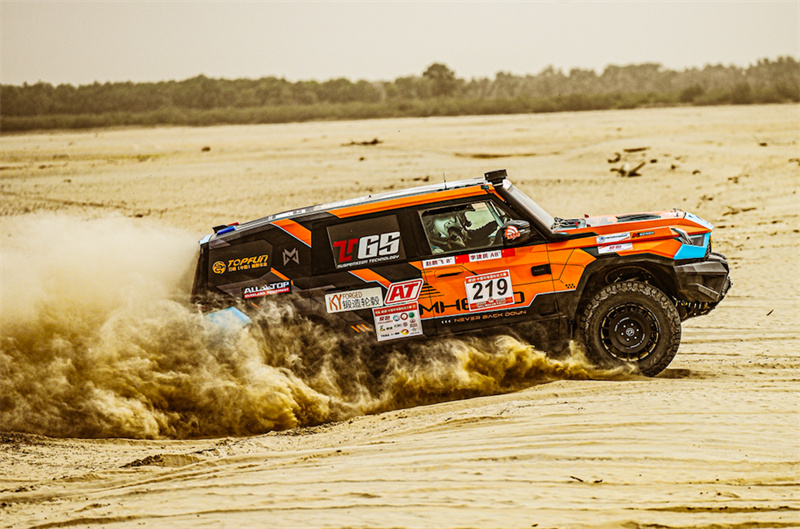 SS4沙海老兵賽段總長612.33公里(特殊賽段246.02公里),以和田河干涸河床為核心,因去年洪水導致原本平坦的白色沙河賽道被斷溝、橫槽及落差臺階取代,成為暗藏風險的高速河道賽段。面對輪胎抓地力、懸掛抗沖擊及高溫沙塵暴的多重考驗,220號車手胡倩坦言:“猛士917軍工級底盤異常扎實,爛石路段抗顛能力遠超其他車輛。”作為首次駕駛新能源車參賽的車手,她坦言:“新能源車確實比燃油車更有勁兒一些,動力更足,路比較爛的時候,電量消耗雖快,但到了砂石路面可迅速回補。”
