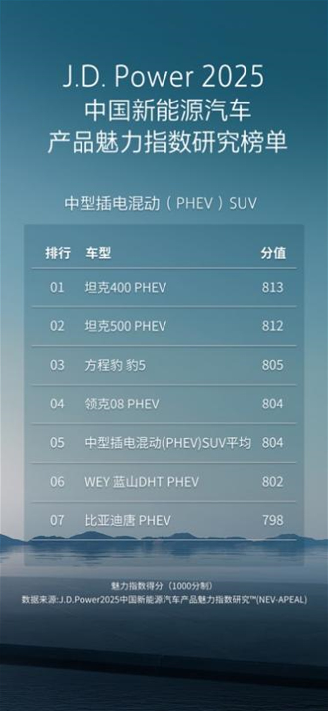 近日,在J.D.Power君迪最新發(fā)布的《2025中國新能源汽車產(chǎn)品魅力指數(shù)研究SM(NEV-APEAL)》中,坦克400 Hi4-T摘得中型插電混動(PHEV)SUV細分市場桂冠。這一獎項不僅是對坦克400 Hi4-T兼具硬核性能與綜合魅力的認(rèn)可,更標(biāo)志著硬派越野車在新能源時代的價值破圈。