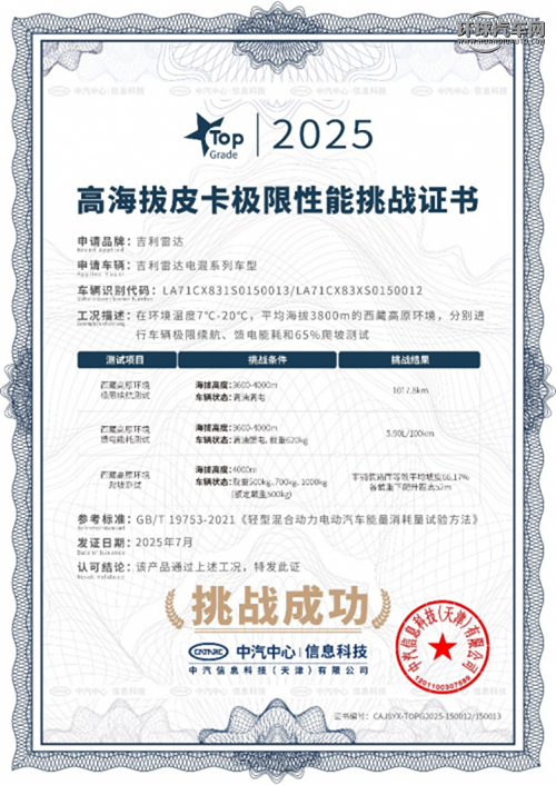 吉利雷達地平線EM-P:通過權威機構三項高海拔極限性能測試