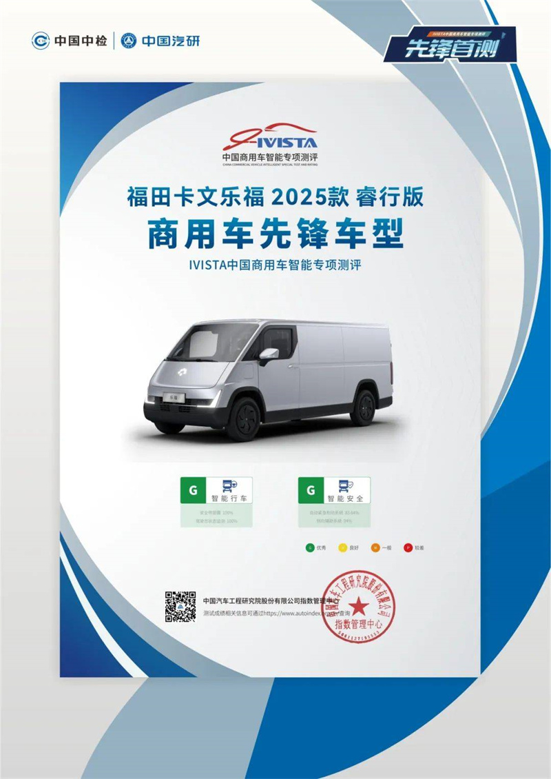 2025年6月底,中國汽研首次對在售輕型商用車進行智能指數(shù)相關抽檢,福田卡文樂福2025款睿行版作為先鋒首測車型接受了嚴苛的大考,完成智能行車、智能安全兩個維度測評,均取得優(yōu)秀(G)的好成績。