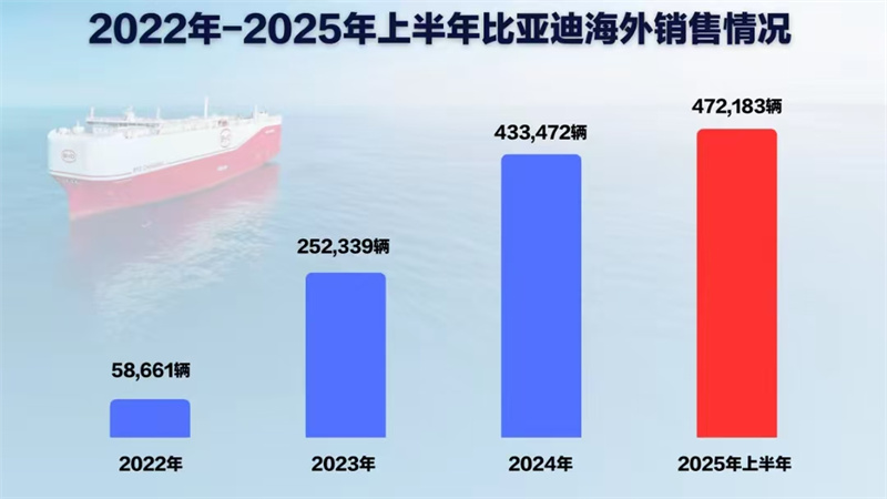 在國內市場持續保持領先地位的同時,比亞迪上半年海外市場表現尤為迅猛。截至6月末,比亞迪海外銷量已連續7個月保持增長,展現出穩健向上的發展趨勢。2025年上半年比亞迪海外銷量達47.2萬輛,同比增長132%,超去年全年總和。其中,“BYD SHARK”皮卡上半年海外累計銷售已超2.6萬輛;全球SUV標桿車型宋PLUS持續熱銷,上半年海外累計銷售超13萬輛。商用車方面,比亞迪新能源客車上半年出口2082輛,同比增長45%,以市場份額27.29%的亮眼成績繼續穩居行業第一。