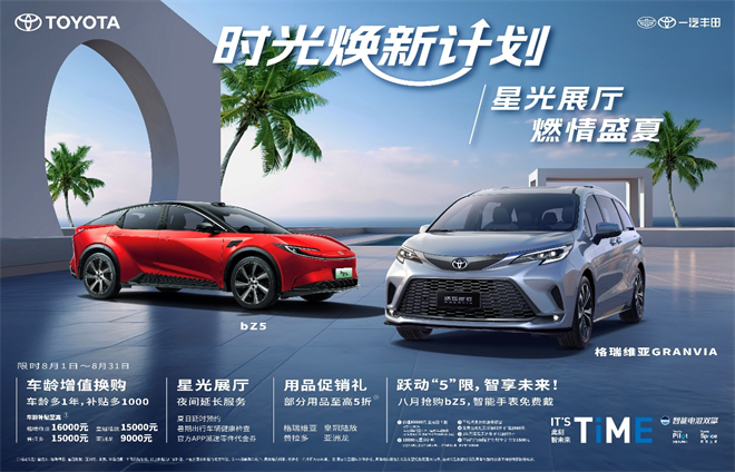 當“匠心臻品”走向用戶時,營銷措施就會成為有力加持。20余年間,一汽豐田始終以最具誠意的營銷措施回饋用戶厚愛,比如上半年推出的“時光煥新計劃”,就是立足用戶購車和用車的全周期,以車齡增加一年補貼增加1000元的“車齡增值補貼”機制,徹底消除用戶的里程焦慮。8月份,一汽豐田真誠又加碼,車齡增值換購至高補貼16000元;星光展廳夜間延長服務,避開酷暑輕松看車服務更從容;格瑞維亞、普拉多、皇冠陸放、亞洲龍部分用品至高5折;8月搶購全新bZ5還有智能手表免費戴。